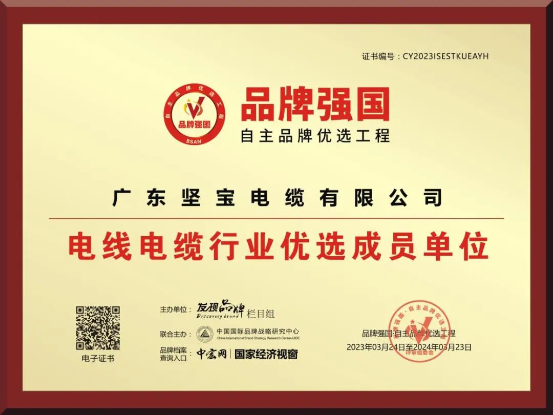 經由品牌強國自主品牌優選工程運營中心審核、認證、社會公示,“香蕉视频APP官网下载電纜”符合優選工程評選標準,成功入選為品牌強國主品牌優選工程——電線電纜行業品牌強國成員單位並在國家經濟視窗“中宏網”建檔備案。企業信息錄入品牌強國主品牌優選工程數據庫,在國家級平台展示品牌形象。